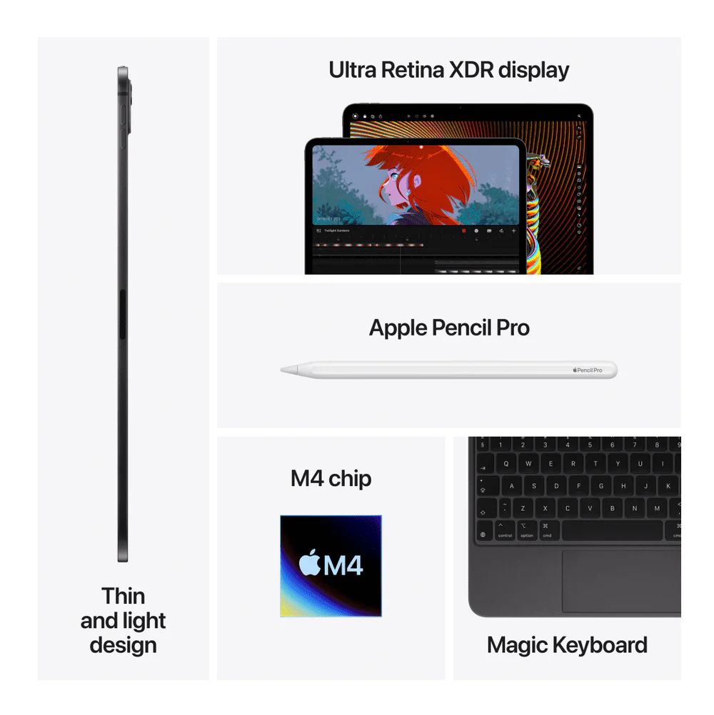 The new iPad Pro is unbelievably thin and equipped with colossal performance from the Apple M4 chip, a boundary-breaking UltraRetina XDR screen and lightning-fast wifi6E. Together with ApplePencilPro and MagicKeyboard, you get endless versatility, creativity and productivity at your fingertips.